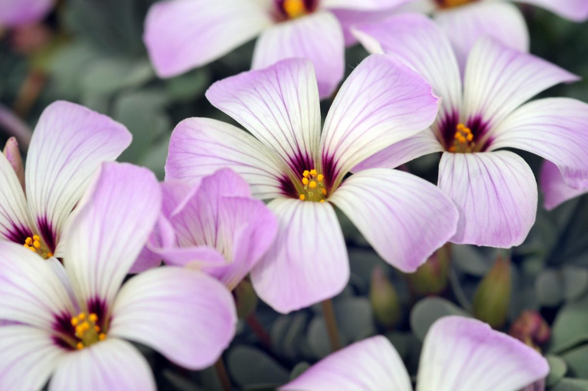 オキザリスも耐寒性のあるものとないものと2つのグループに分けることができます。オキザリス・デッペイ、オキザリス・ラシアンドラ、オキザリス・レグネ リーなどは耐寒性がありません。花は日の光を浴びると大きく開き、暗くなると閉じます。葉はクローバーの形をしています。